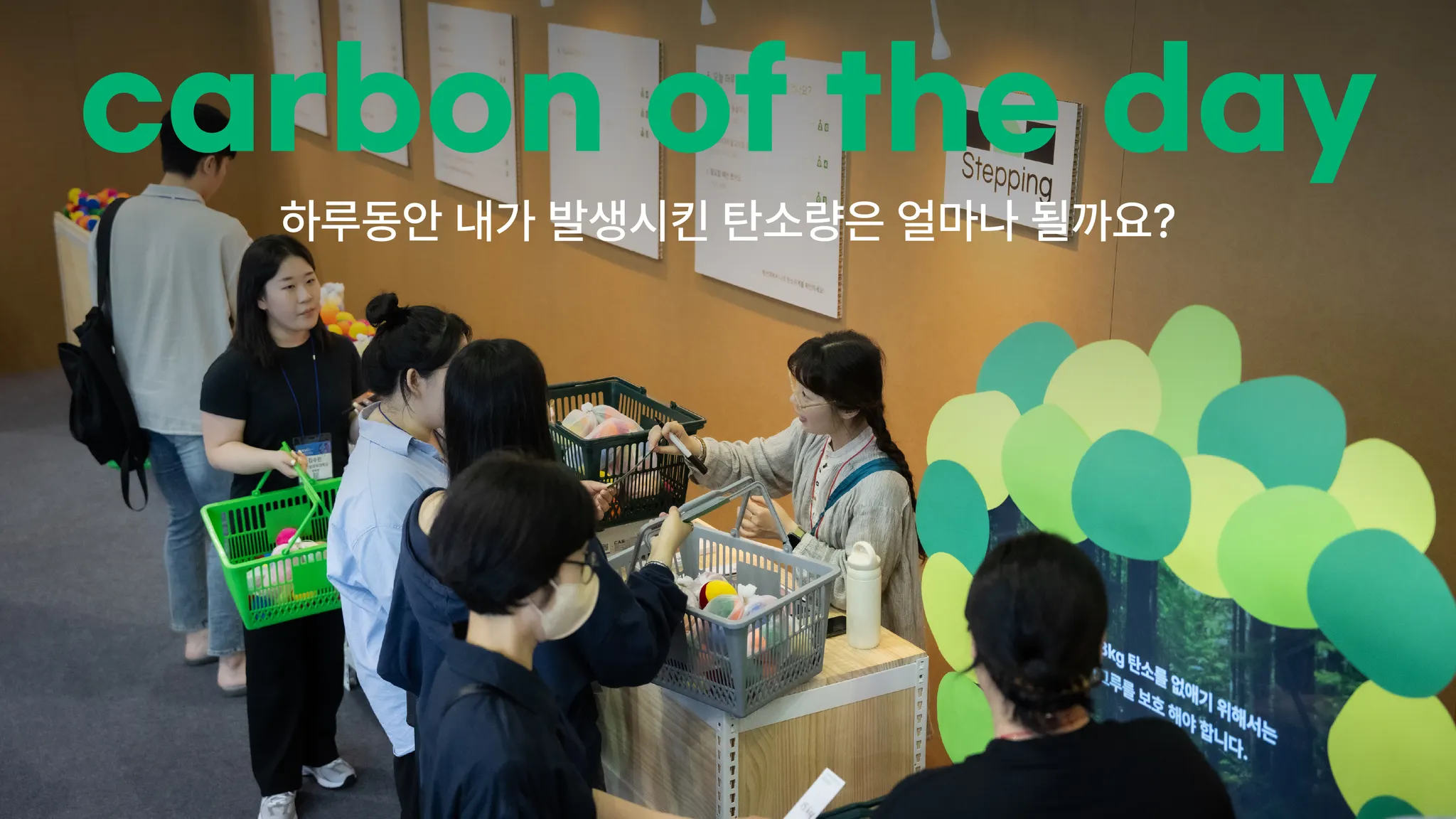 <carbon of the day>는 2023 기후산업국제박람회에서 진행한 탄소중립 이벤트 부스로, 탄소중립 개념을 쉽게 이해할 수 있도록 하루의 탄소무게를 계산해보고 숲 보호를 통해 탄소상쇄도 직접 해보는 체험형 콘텐츠를 메인으로 진행하였다. 행사 콘텐츠 기획 및 제작, 디자인 브랜딩, SNS 홍보마케팅을 전반을 전담하였으며 운영시간 1,260분동안 1,060명의 참관객 달성, 1.1분당 1명꼴로 부스를 체험하였으며(1인당 평균 체험 시간 5~10분) 90%이상이 팔로우 및 경품 이벤트에 참가했다.