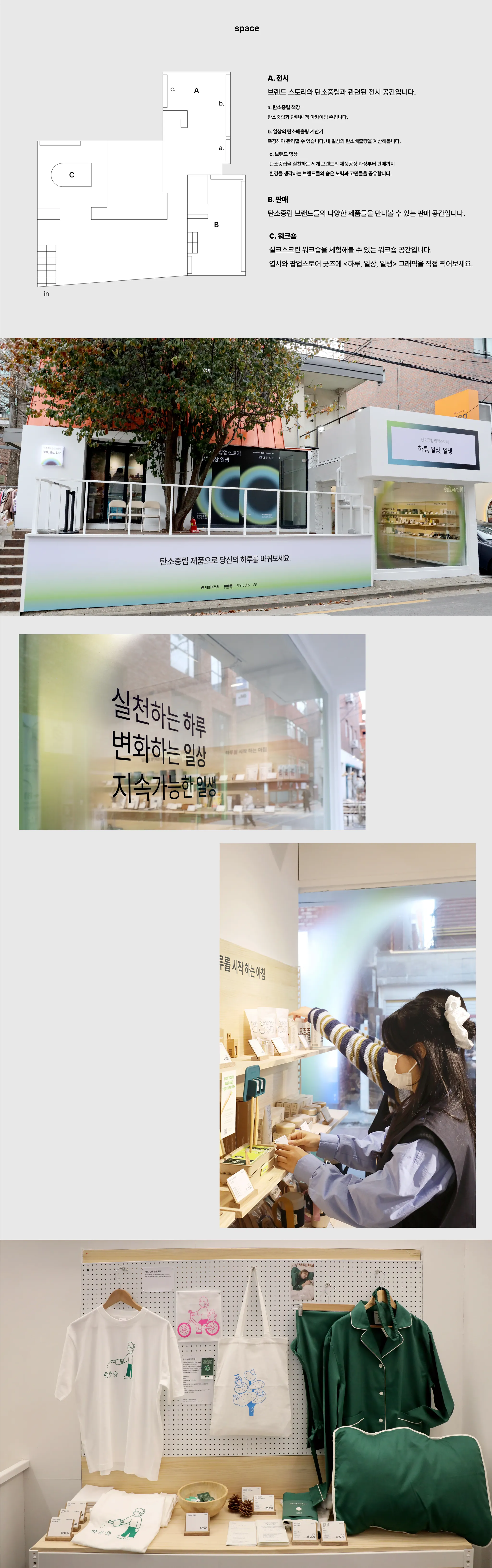 <하루,일상,일생>탄소중립 팝업스토어는 내일의쓰임이 운영하는 스테핑 서비스를 주제로, 다양한 탄소중립 브랜드를 소개하는 팝업스토어다. “실천하는 하루, 변화하는 일상, 지속가능한 일생”이라는 슬로건을 바탕으로 우리가 평소에 인식하지 못했던 내 일상 속의 탄소배출량(보지못하고 감춰져 있던 것, 존재했으나 느끼지 못하고 있던 것, 이면)을 보게 해준다는 테마를 중심으로 타이포와 그래픽으로 녹여 전체 디자인 방향 설정했다. 스테핑의 브랜드 아이덴티티를 높이기 위해 디자인 브랜딩 뿐만 아니라 참관객들의 경험소비를 이끌어 낼 수 있는 체험형 콘텐츠 기획/제작부터 SNS 콘텐츠 제작, 홍보마케팅, 공간구성, 운영 전반을 진행하였다.